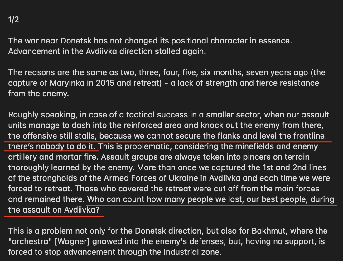 Dmitri On Twitter Russian Mil Reported Voenkor Admits After 8 Months That The Offensive In Donetsk Area Stalled Completely Both Due To Lack Of Manpower And Insufficient Artillery Neither Army Nor Wagner